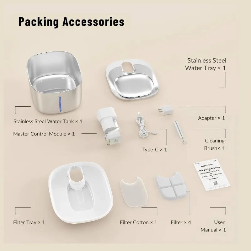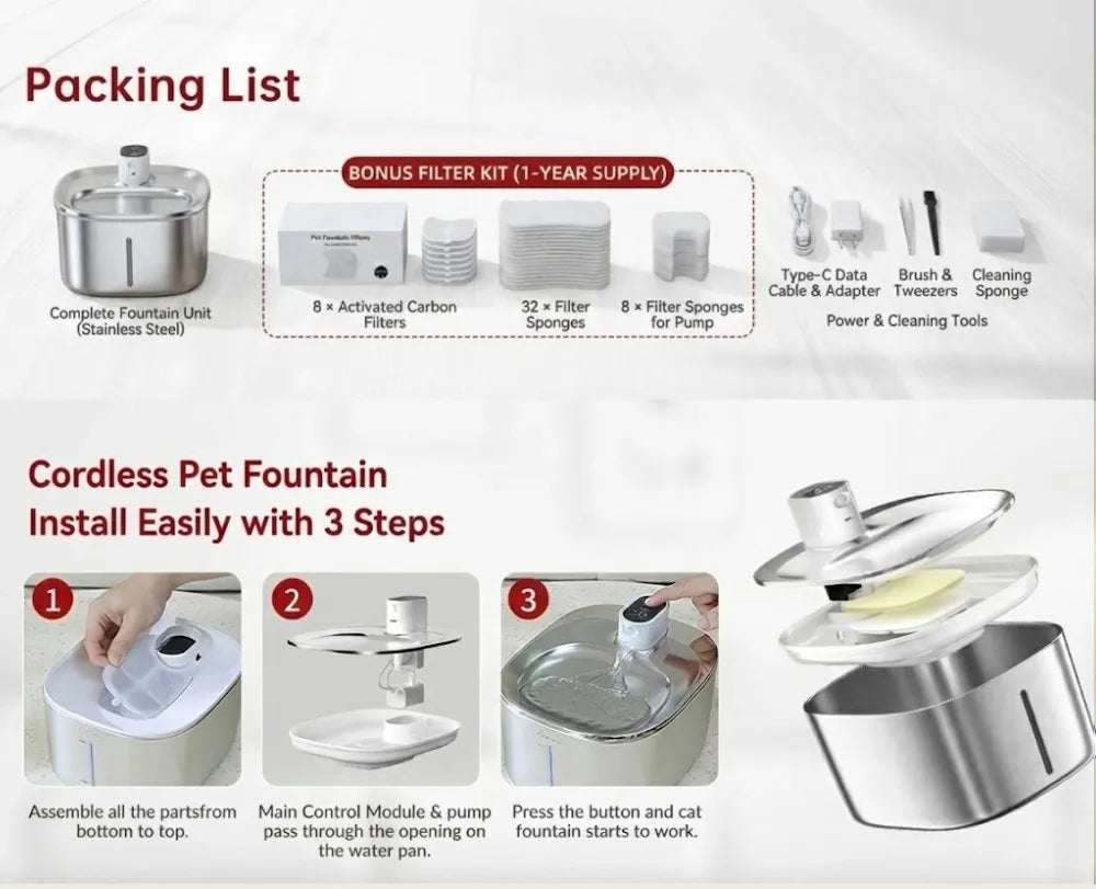 Cat fountain wireless 135fl oz/4L*1,Main control module and pump*1,Filter & 4 x Filter sponge*1,TYPE-C USB cable and power adapter*1,Cleaning set*1,User manual*1
